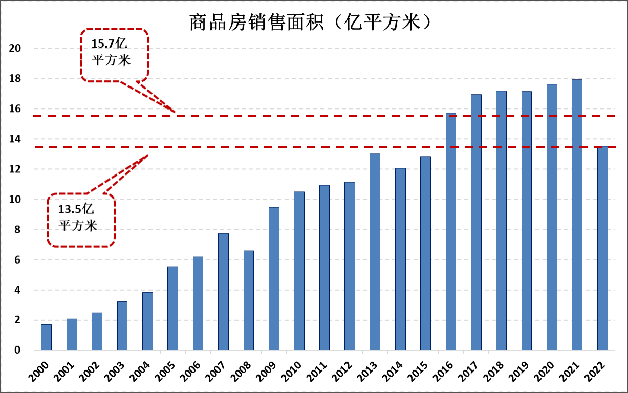 在2022年,商品房销售面积仅为13.5亿平方米,低于理论需求值15.7亿平方米,这与生活中许多居民因为疫情、担忧房价下跌等原因迟迟不敢购房,需求出现积压的现象所匹配。假设2023年的商品房销售面积出现了部分投资者定义的“复苏”现象,即商品房销售面积回到2019年或者2021年的水平值,那么房地产行业已经不是复苏而是严重过热,17-18亿平方米的销售面积远高于房地产行业的真实需求。因此,已有研究中,用2019年或者2021年房地产销售面积作为基数,分析房地产销售是否出现复苏的分析框架是存在问题的,无论房地产行业是否出现明显的复苏迹象,以2019年或者2021年为基数计算得到的房地产销售面积增速都将是负值。