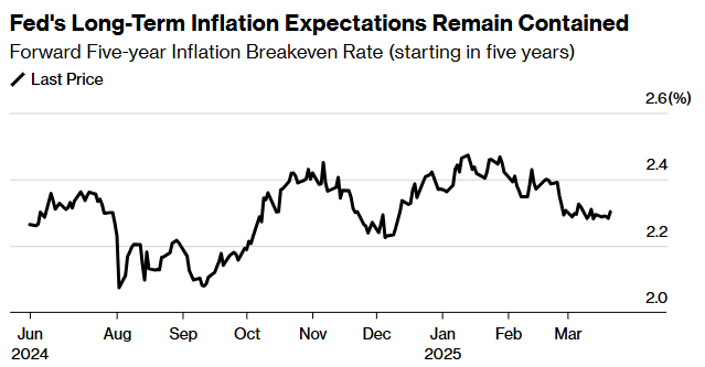 通常情况下,更重视长期通胀预期,因为它们被视为排除了短期干扰。美联储青睐的长期通胀预期市场指标之一——5年期远期通胀率目前在2.3%左右,而今年1月份的峰值为2.47%。