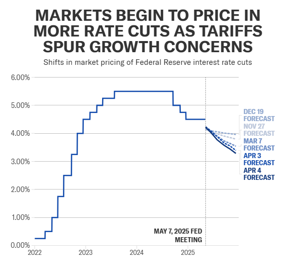 面对关税的破坏性冲击,与美联储会议相关的期货合约的交易活动显示,市场已从预计今年降息不到三次变为近四次。上周进行的其他期货交易预计,美联储可能只会缓慢行动,但这一结果最终会导致明年更大幅度的降息。