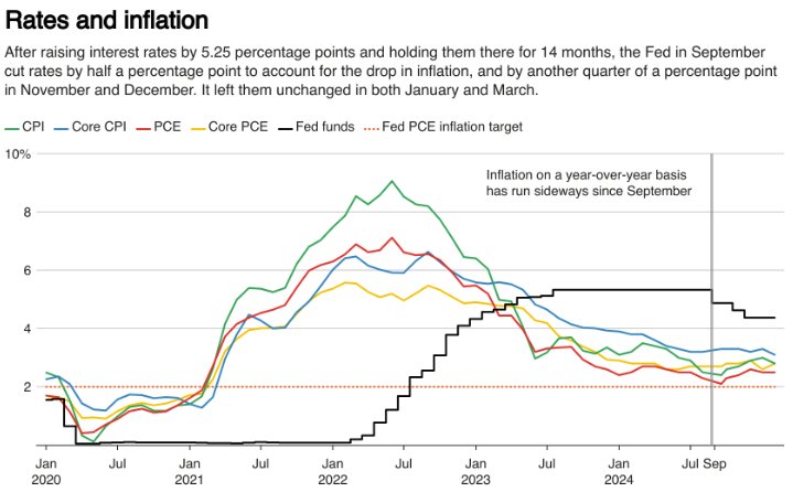 但在美联储最近的决策中,避免落后于形势也同样重要。如果鲍威尔和其他官员似乎倾向于降息以稳定经济,美联储将面临的风险是:通胀仍较高,经济需要利率保持在较高水平。