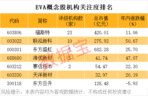 据统计,A股市场EVA概念股有联泓新科、东方盛虹、福斯特、海优新材、天洋新材等。其中,联泓新科EVA业务继续稳坐高端阵营,全部锁定高VA含量产品,主要用在光伏胶膜、电缆、鞋材等热门赛道;东方盛虹2025上半年新增EVA产能40万吨,总产能达90万吨/年。