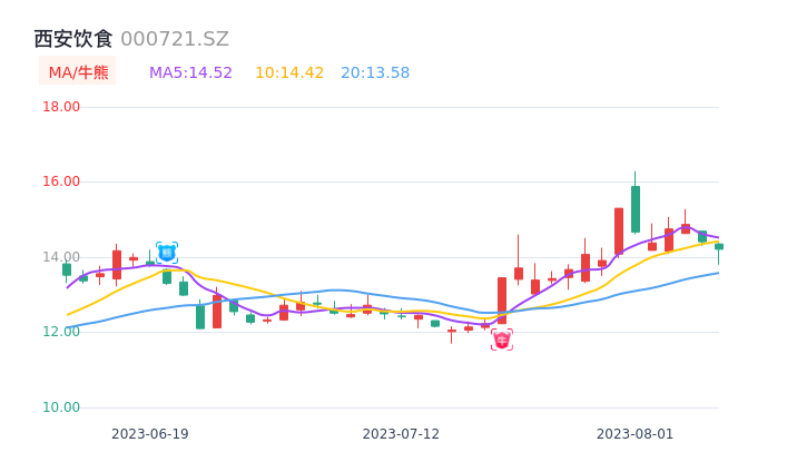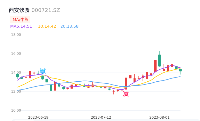 西安饮食在7月20日出现牛点,在7月20日出现MACD0轴以下的金叉,且在7月26日出现了双线上穿0轴,目前处于强势调整阶段,后续关注MACD是否重新死叉。