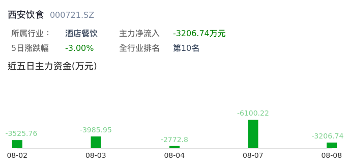 西安饮食近日从持仓区下穿到观望区,股价出现持续性调整行情。短期已经转为空头行情,且下跌动能仍未衰竭。建议继续谨慎观望。