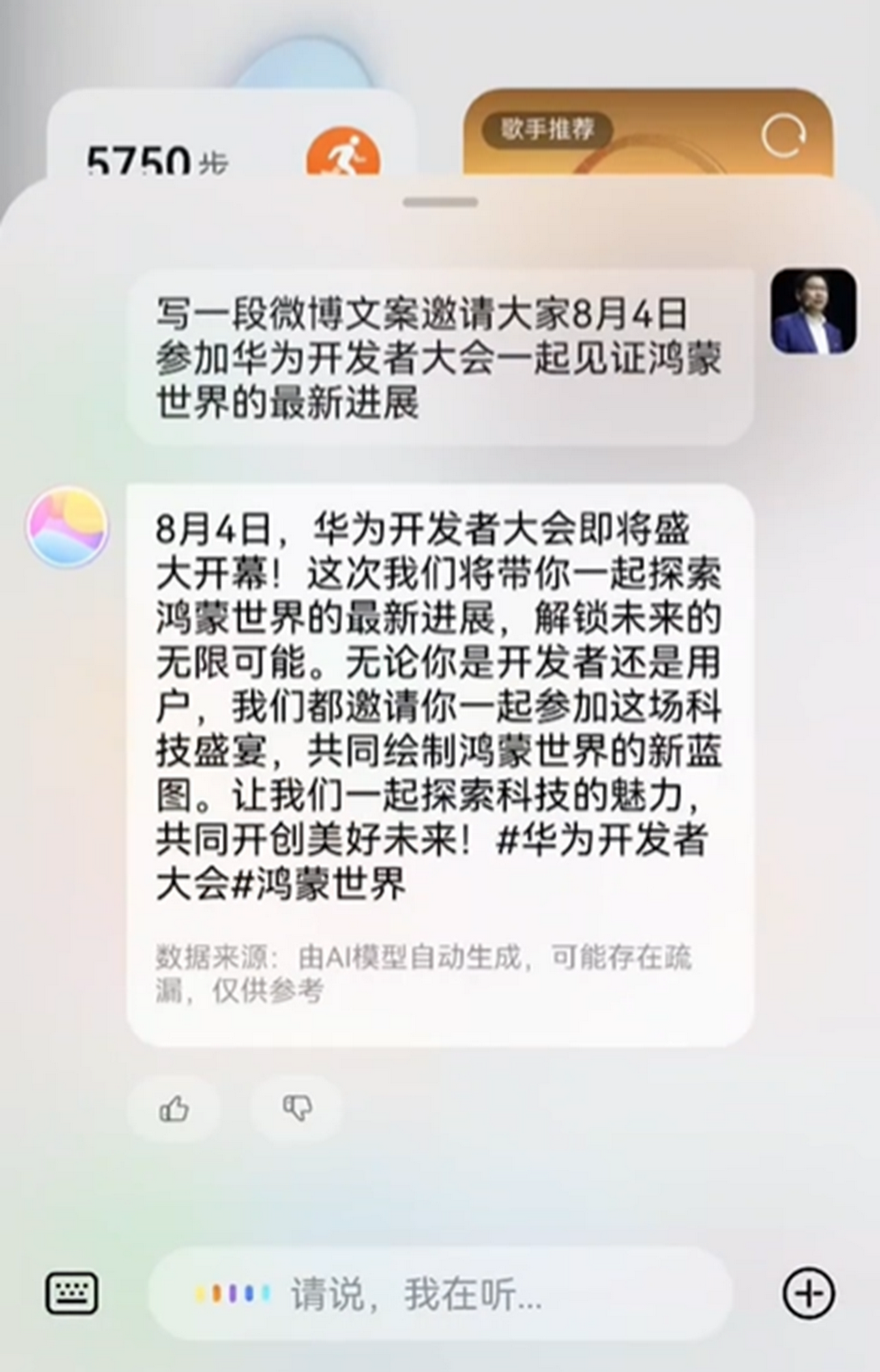 从该视频可以看出,小艺可以根据用户需求,自动生成文案等内容。而在小艺的回答下方有一行提示——“数据来源:由AI模型自动生成,可能存在疏漏,仅供参考”。