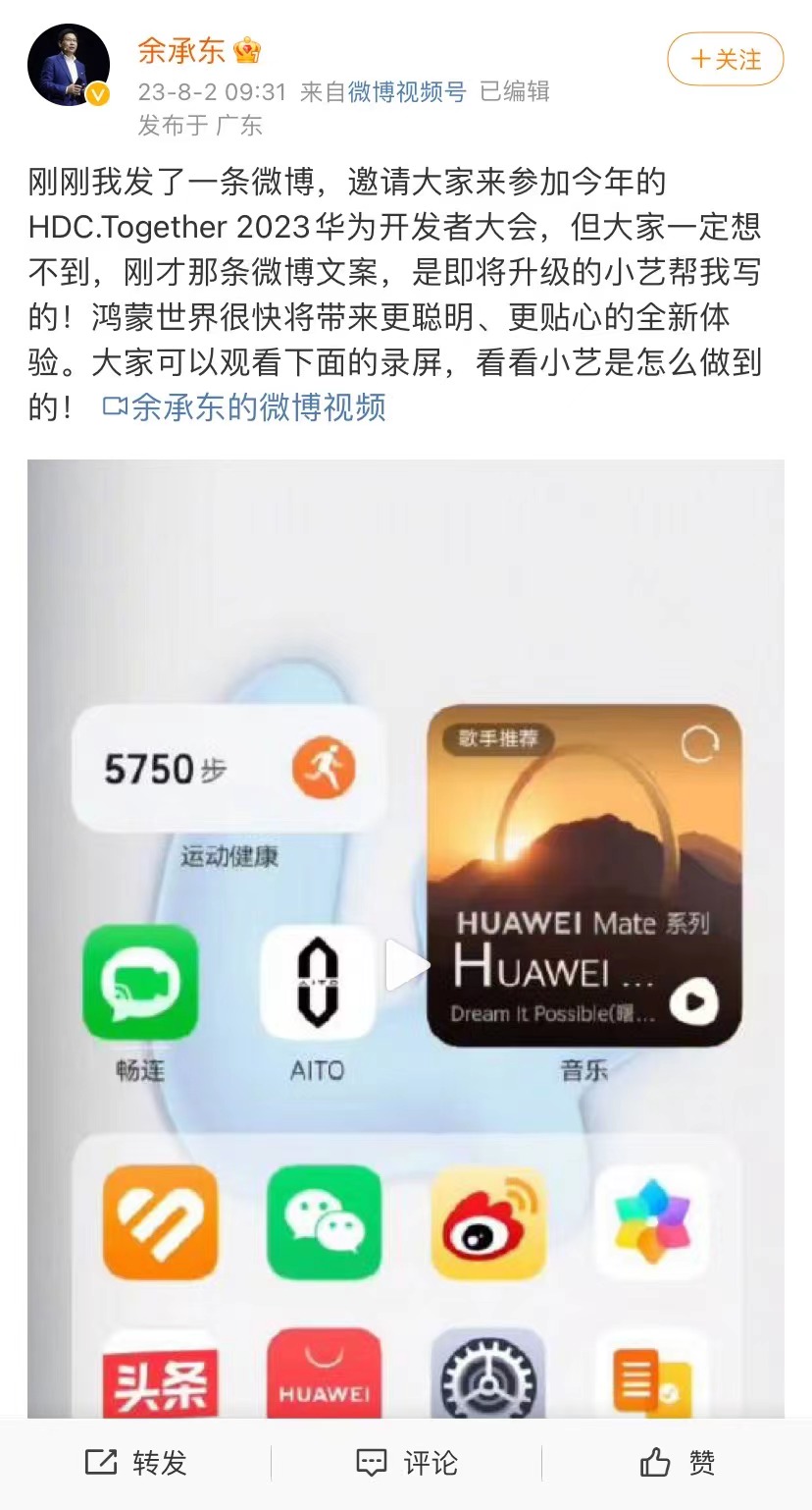 今日,华为常务董事、终端BGCEO余承东在微博“剧透”了HarmonyOS一项功能。其表示,自己上一条发出的华为开发者大会宣传微博文案,来自HarmonyOS小艺语音助手。
