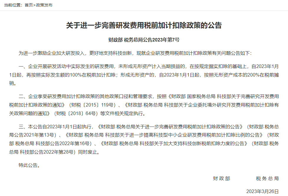 财政部、税务总局发布《关于进一步完善研发费用税前加计扣除政策的公告》。其中提出,企业开展研发活动中实际发生的研发费用,未形成无形资产计入当期损益的,在按规定据实扣除的基础上,自2023年1月1日起,再按照实际发生额的100%在税前加计扣除;形成无形资产的,自2023年1月1日起,按照无形资产成本的200%在税前摊销。