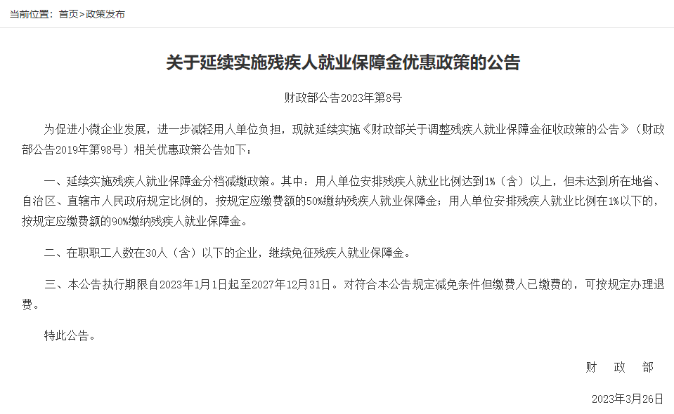 财政部发布关于延续实施残疾人就业保障金优惠政策的公告。其中提出,延续实施残疾人就业保障金分档减缴政策。其中,用人单位安排残疾人就业比例达到1%(含)以上,但未达到所在地省、自治区、直辖市人民政府规定比例的,按规定应缴费额的50%缴纳残疾人就业保障金;用人单位安排残疾人就业比例在1%以下的,按规定应缴费额的90%缴纳残疾人就业保障金。本公告执行期限自2023年1月1日起至2027年12月31日。对符合本公告规定减免条件但缴费人已缴费的,可按规定办理退费。