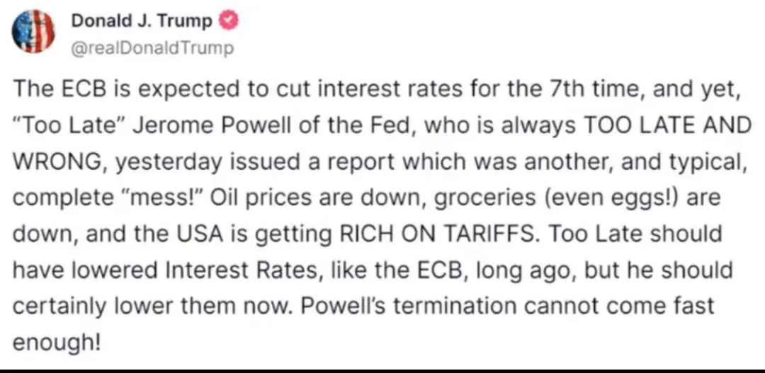 此前,特朗普在社交媒体表示,预计欧洲央行将进行第七次降息,然而,美联储主席鲍威尔的行动“为时已晚”,他总是行动太迟且决策错误。昨天他的发言又是典型的、彻头彻尾的“一团糟”!目前油价下跌了,食品杂货价格也下跌了,而且美国正从关税中获利颇丰。美联储早就应该像欧洲央行那样降低利率。很久之前就该这么做了,现在美联储肯定应该降低利率。鲍威尔被解雇的速度再快都不为过!