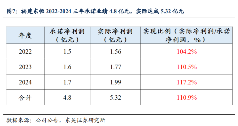 福建东恒超额完成业绩承诺,未来将持续增厚公司业绩。2022年以来,福建东恒持续超额兑现业绩承诺。2022-2024三年东恒合计承诺净利润4.8亿元,实际达成5.32亿元,达成比例达110.9%;2024年1.7亿元承诺净利润,东恒实际达成1.99亿元,公司持股东恒51%,2024年对应1.0亿元业绩贡献度。
