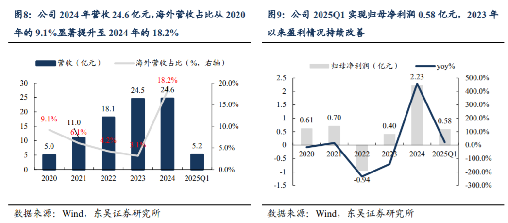 2)客户层面,公司为宁德时代、孚能科技、大众、华晨宝马等国内外主流客户提供配套,2024年突破北美龙头客户及多个海外头部客户,海外订单加速放量。截至2024年末,公司智能装备业务订单规模达30.3亿元,其中68%来自海外。公司2024年海外综合毛利率达29.9%,高于国内业务6pct;在手海外订单为公司盈利能力提升奠定基础。