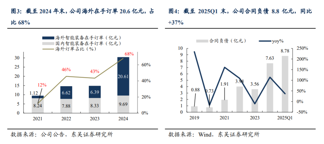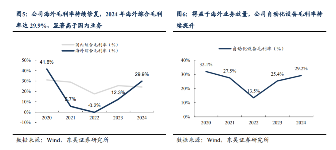 截至2024年末,公司智能装备业务订单规模达30.3亿元,其中68%来自海外。公司2024年海外综合毛利率达29.9%,高于国内业务6pct;在手海外订单为公司盈利能力提升奠定基础。