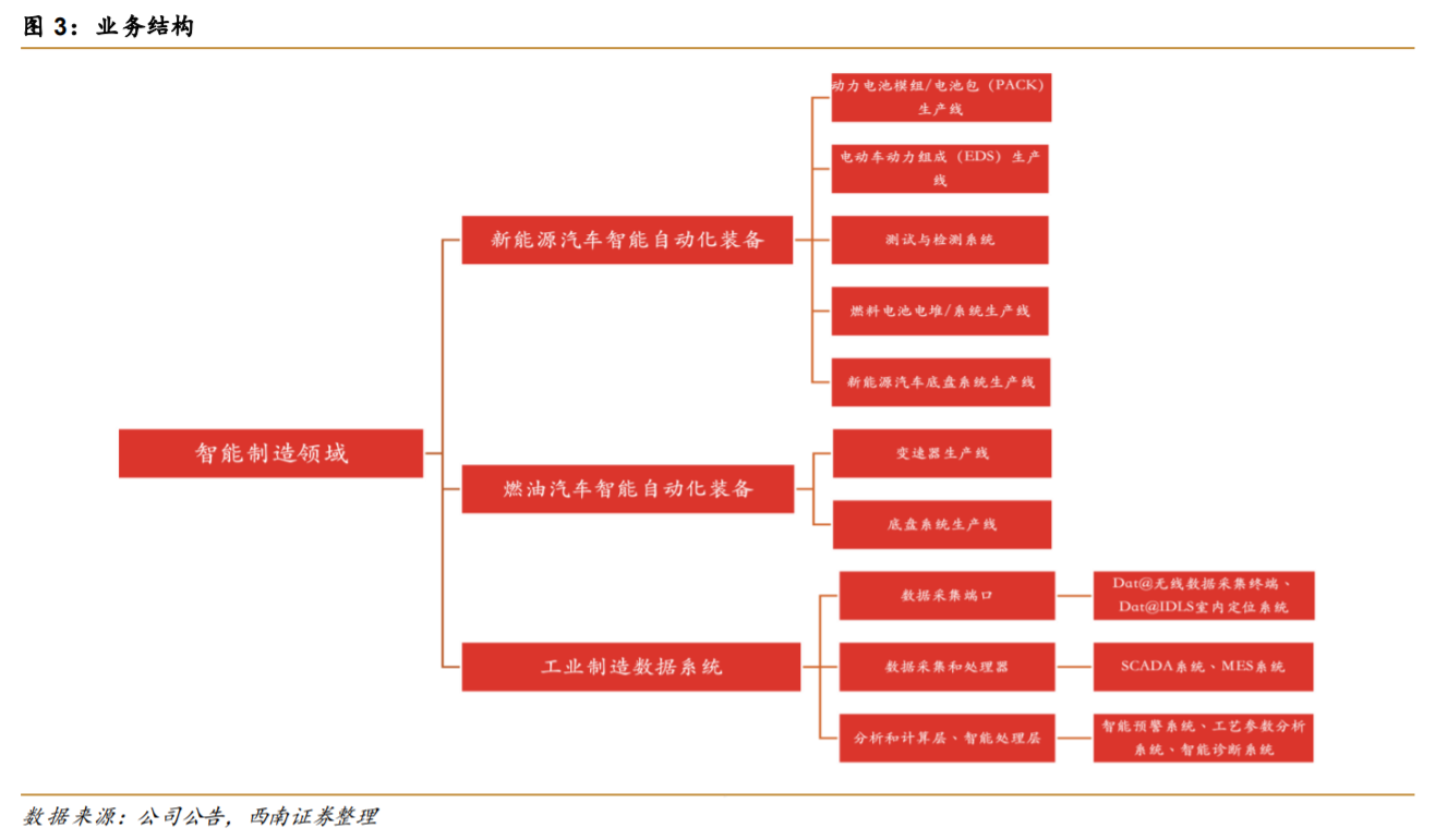 公司主营业务为新能源汽车智能制造装备业务、新能源电池零部件业务、工业制造数据系统业务。公司目前经营以动力电池结构件及新能源车装备业务为主,此外还涉足自动充电机器人,数据要素等新能源车行业相关新兴领域。