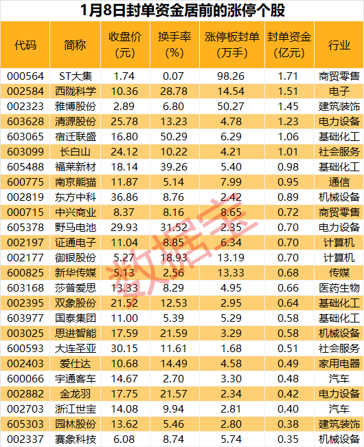 以封单金额计算,6股封单金额超亿元,ST大集、西陇科学和雅博股份封单资金居前,分别为1.71亿元、1.51亿元、1.45亿元。