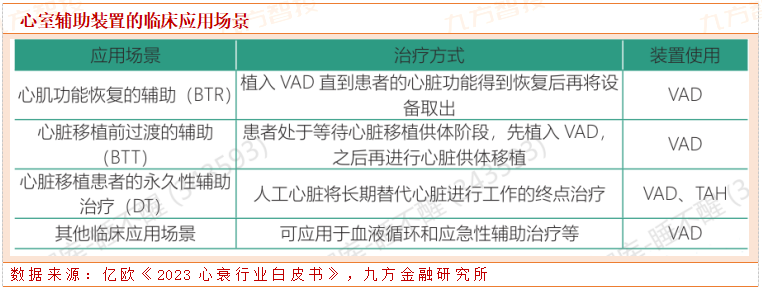 心室辅助装置的临床应用场景 心室辅助装置的临床应用场景主要分为促进心肌功能恢复的辅助(Bridge To myocardial Recovery, BTR)、心脏移植前过渡的辅助(Bridge To Transplant, BTT)以及不能进行心脏移植患者的永久性治疗(Destination Therapy, DT)。根据机械支持的时间长短,VAD又可以分为短期/中期支持和长期支持两类。