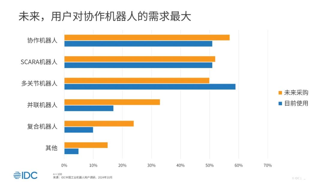 从产品类型来看,更多用户(57%)未来计划进一步采购协作机器人,对SCARA机器人和多关节机器人亦有较高需求。协作机器人具有更智能的安全保护措施和更灵活的部署方式,与AI应用快速融合,是目前具身智能工业机器人的重要载体形态。