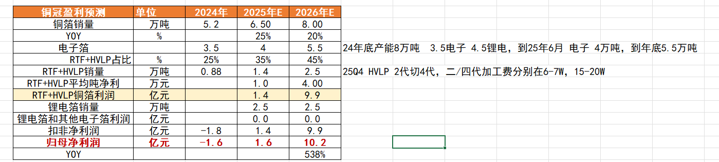 盈利预测&空间:预计26年10-13亿利润,RTF+HVLP明年销量2.5万吨,按单吨4万元净利润计算这块可以供需10个亿的净利润,悲观假设锂电铜箔这块明年可以不亏损,普通电子铜箔预期在1-3亿利润。给26年30被估值,看300亿估值合理。目前266亿市值,基本处于合理市值范围。