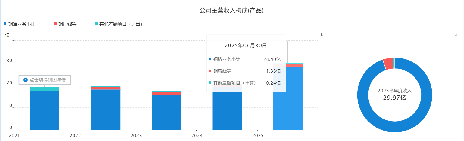 25H1实现营收29.97亿元、同比+45%,其中铜箔业务占比28.4亿,占比94%,是公司主业。(1)PCB铜箔:HVLP卡位优势明显,报表逐步验证高景气趋势。其中PCB铜箔+锂电铜箔分别实现收入17亿和11.37亿。伴随AI在全球范围的高速发展,作为AI服务器基材的HVLP铜箔需求旺盛,并保持持续增长态势,高频高速基板用铜箔(HVLP+RTF)产量占PCB铜箔总产量的比例已突破30%,其中HVLP铜箔25H1产量已超越2024年全年产量水平;25H1PCB铜箔营收达17.03亿元、同比+29%,毛利率为5.56%、同比+2.77pct,毛利率同比有较为明显改善,判断主因系高频高速基板用铜箔(HVLP+RTF)产量占比提升拉动;公司在PCB用高阶铜箔领域卡位优势明显,RTF铜箔产销能力于内资企业中排名首位,HVLP1-3铜箔已向客户批量供货,HVLP4铜箔正在下游终端客户全性能测试,载体铜箔已掌握核心技术,正在准备产品化、产业化工作。锂电铜箔:经营层面同样实现积极改善,产品逐步转向向4.5um、5um等高附加值。25H1锂电铜箔营收达11.37亿元、同比+93%,毛利率为0.24%、同比+5.82pct。