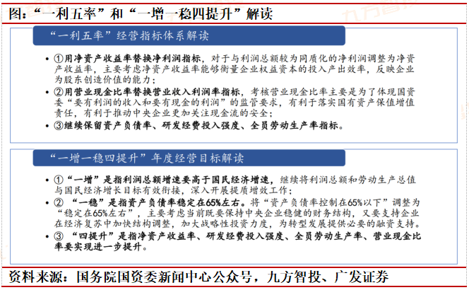 按照“一利五率”考核指标体系,聚焦实现“增一稳四提升”目标,推动中央企业利润总额增速高于全国GDP增速,力争取得更好成绩;资产负债率总体保持稳定;净资产收益率、研发经费投入强度、全员劳动生产率、营业现金比率4个指标进一步提升。