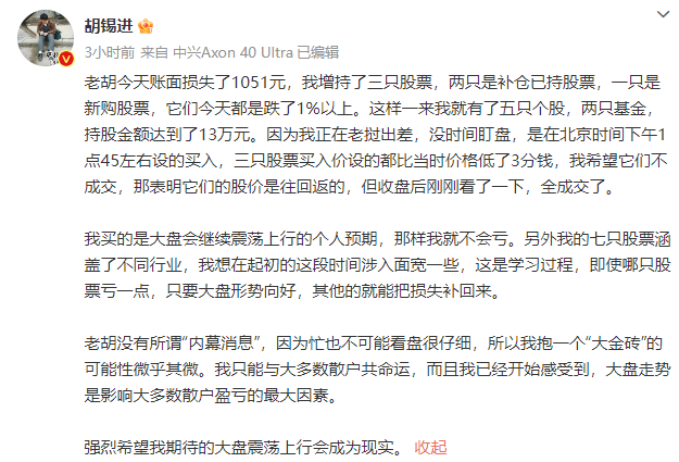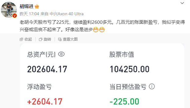 本周一,胡锡进在微博晒出持仓,称自己当日股市亏了225元,但总盈利仍有2600多元。亏了几百元后,胡锡进表示,自己“似乎变得兴奋或沮丧不起来了”,并认为“好像这是进步”。