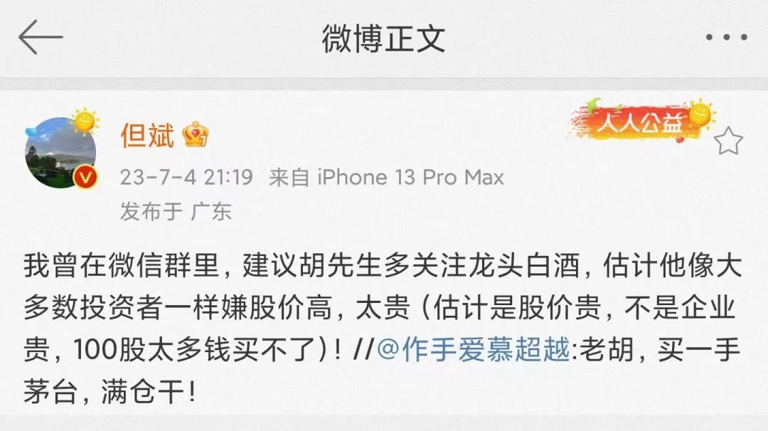 但斌发文表示,曾在微信群里,建议胡先生多关注龙头白酒,估计他像大多数投资者一样嫌股价高,太贵(估计是股价贵,不是企业贵,100股太多钱买不了)!