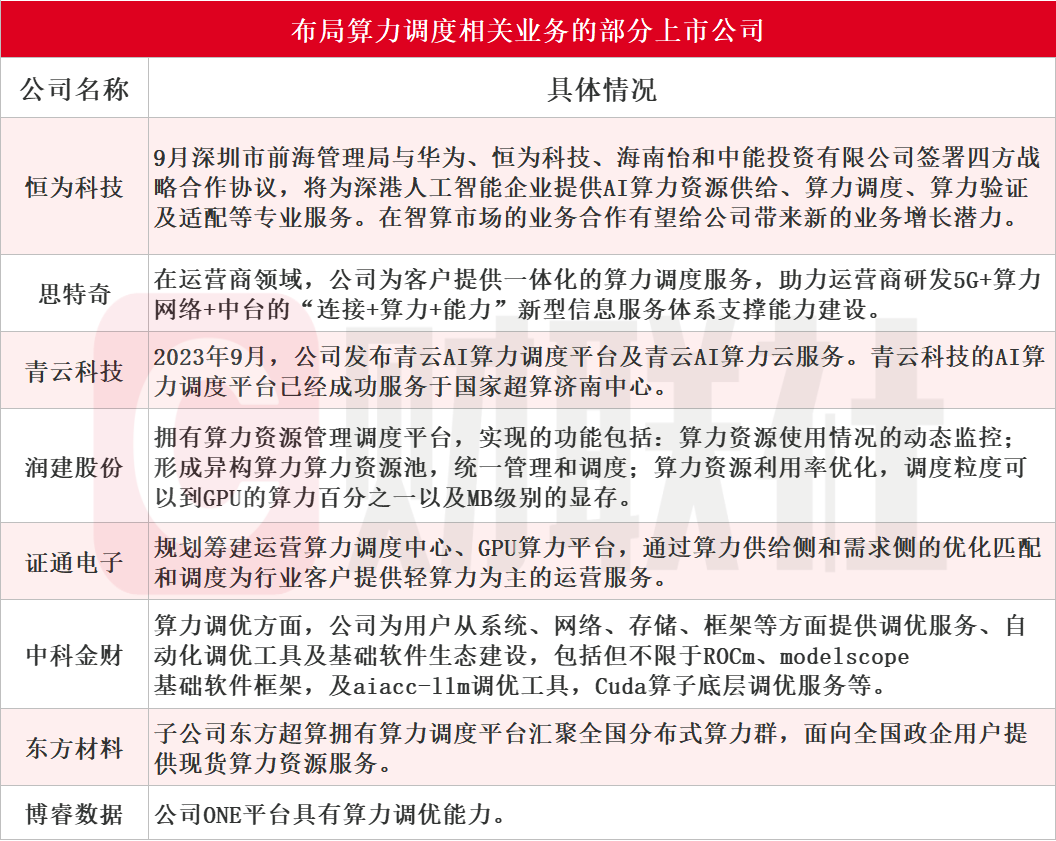 据不完全统计,A股算力调度相关的上市公司包括恒为科技、思特奇、青云科技、润建股份、证通电子、中科金财、东方材料和博睿数据等,具体情况如下: