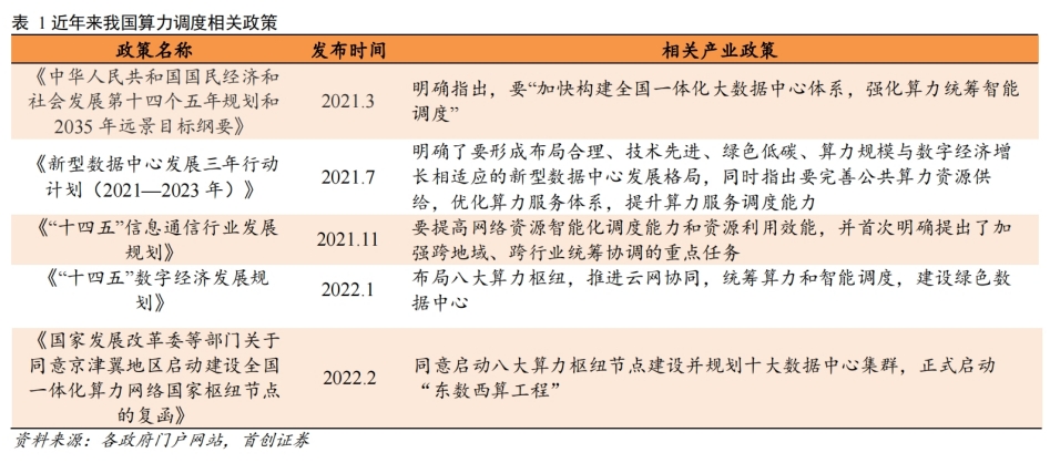我国已发布多项有关算力调度的政策文件。其中《新型数据中心发展三年行动计划(2021—2023年)》指出要完善公共算力资源供给,优化算力服务体系,提升算力服务调度能力。2022年2月,国家全面启动“东数西算”工程。打通东西部算力资源、实现东西部算力协同,需要区域间算力的灵活调度。