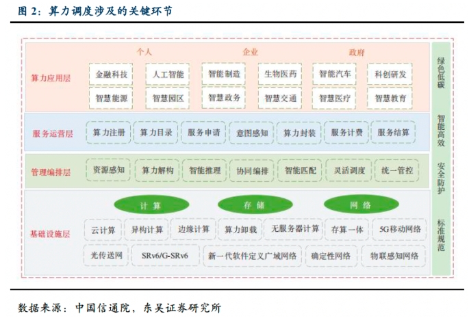算力调度分为基础设施建设、算力调度平台建设、服务运营和算力应用层。东吴证券分析师王紫敬、王世杰研报认为,算力调度运营是商业模式最好、空间最大的环节。算力调度运营能够坐拥平台流量,帮助客户解决闲置算力,有望实现“抽成”商业模式。从算力调度的范围来看,可以分为全国算力调度、区域算力调度、企业级算力调度。