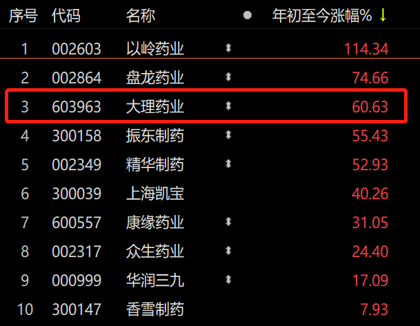 从大理药业所属的中药板块来看,年初至今涨幅位列第三,仅次于以岭药业和盘龙药业。