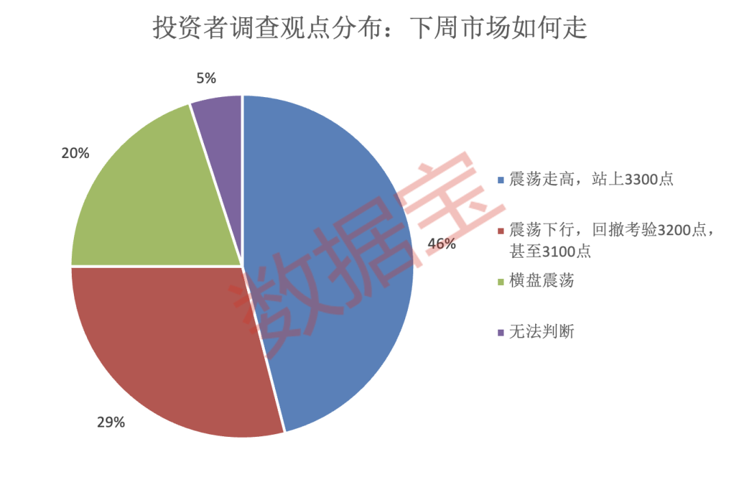 对于接下来一周的大盘走势,多数投资者认为大盘将“震荡走高,站上3300点”,占比46%。