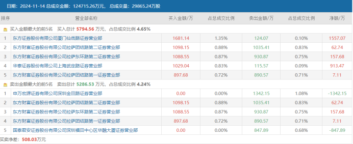 其余个股方面,今日同样涨停的ST股中,ST九芝、*ST人乐、ST百灵、ST恒久4只标的今日登上龙虎榜单,且均为三日榜。其中,ST百灵龙虎榜成交总额超1亿元,在4只个股中位居首位。具体席位上看,知名游资东方证券厦门仙岳路、华泰证券上海武定路位列其买入榜前五席位中。而*ST人乐、ST恒久2股今日的龙虎榜中机构席位出现频次的相对较高。