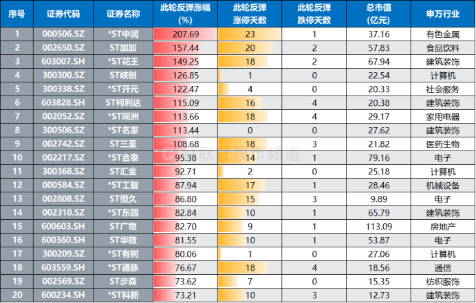 ③ 此轮反弹期间,ST股平均上涨近46.7%,高于沪深非ST股表现,其中,9只ST股涨幅翻倍。