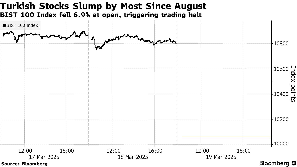 在土耳其总统埃尔多安的政治竞争对手Ekrem Imamoglu被捕后,土耳其上演股债汇三杀:股市暴跌近7%,10年期国债收益率飙升至今年以来的最高水平,里拉汇率也再创新低。数据显示,伊斯坦布尔100指数暴跌6.9%,触发熔断机制;基准十年期土耳其国债收益率飙升97个基点,至29.16%;美元兑土耳其里拉汇率大涨超11%,至1美元兑40.8374土耳其里拉。