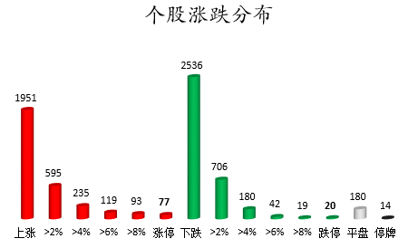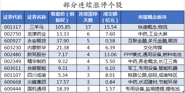 截至收盘,沪深两市合计1951只个股上涨,2536只个股下跌,平盘个股180只,停牌的个股14只。不含当日上市新股,共有77只个股涨停,20只个股跌停。连续涨停天数看,三羊马已连收17个涨停板,连续涨停板数量最多。