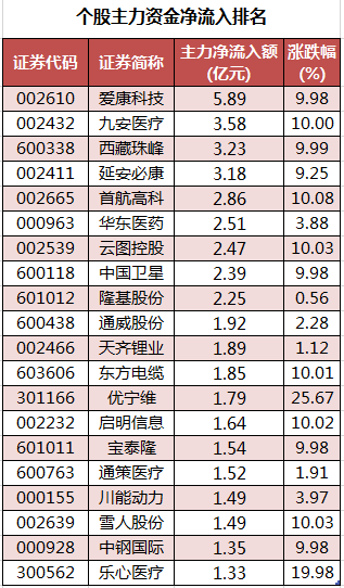 个股来看,今日有1560只个股获主力资金净流入,其中,42股获主力资金净流入超1亿元。爱康科技获主力资金净流入最多,净流入金额为5.89亿元;主力资金净流入居前的个股还有九安医疗、西藏珠峰、延安必康、首航高科、华东医药,净流入金额分别为3.58亿元、3.23亿元、3.18亿元、2.86亿元、2.51亿元。