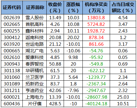 盘后龙虎榜数据显示,今日机构席位资金合计净卖出约5.34亿元。其中,净买入的个股5只,净卖出的个股9只。机构净买入最多的股票是雪人股份,净买入金额约1.38亿元;机构净买入居前的还有首航高科、鑫科材料等股。机构净卖出最多的股票是片仔癀,净卖出金额约4.01亿元。机构净卖出靠前的还有上海电力、亨迪药业、拓新药业等股。