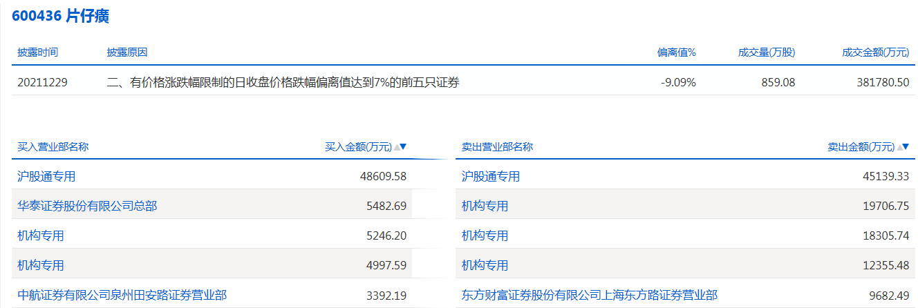 片仔癀今天跌停。盘后数据显示,5个机构出现在龙虎榜单上,合计净卖出4.01亿元;沪股通专用席位买入4.86亿元,同时卖出4.51亿元;华泰证券股份有限公司总部买入5482.69万元;东方财富证券股份有限公司上海东方路证券营业部卖出9682.49万元。
