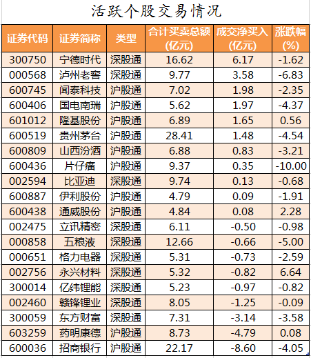活跃个股方面,宁德时代、泸州老窖、闻泰科技、国电南瑞、隆基股份北向资金净买入较多,净买入金额分别为6.17亿元、3.58亿元、1.98亿元、1.97亿元、1.65亿元。招商银行、药明康德、东方财富、赣锋锂业、亿纬锂能北向资金净卖出较多,净卖出金额分别为8.6亿元、4.79亿元、3.14亿元、1.25亿元、0.97亿元。