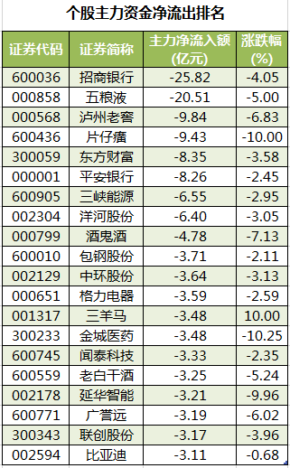 此外,3025只个股被主力资金净卖出,其中,111股被主力资金净卖出超1亿元。主力资金净流出最多的个股是招商银行,净流出金额为25.82亿元;主力资金净流出居前的个股还有五粮液、泸州老窖、片仔癀、东方财富、平安银行,净流出金额分别为20.51亿元、9.84亿元、9.43亿元、8.35亿元、8.26亿元。