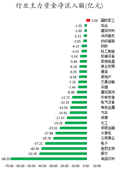 从行业板块来看,申万所属的28个一级行业,今日仅有国防军工1个行业板块主力资金呈现净流入,净流入金额为3亿元。27个行业板块主力资金呈现净流出,其中,食品饮料行业板块主力资金净流出最多,净流出金额为68.55亿元;行业板块主力资金净流出靠前的还有银行、医药生物、电子、公用事业、计算机、非银金融,净流出金额分别为42.45亿元、40.59亿元、37.21亿元、29.78亿元、27.88亿元、23.92亿元。