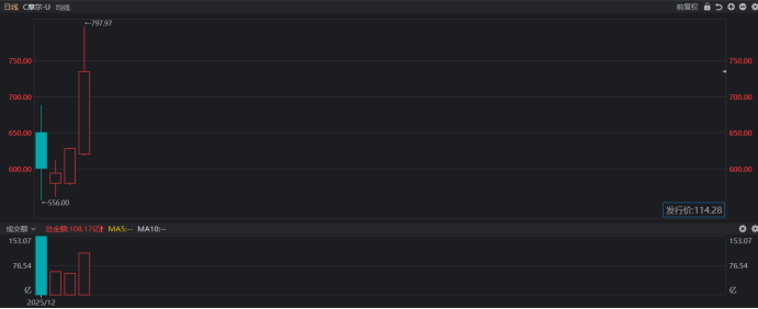 目前,摩尔线程最新收盘价较发行价累计涨幅近543.16%,以单签500股计算,若上市后持有至今,其单签可盈利31.04万元,较首日单签盈利规模增厚近6.73万元,同时较首日单签最大盈利也有近2.34万元的提升。此外,从量能数据上看,摩尔线程今日也放量明显,全天成交额108.17亿元,较昨日接近翻倍增长,同时也是其上市以来第二次百亿成交。