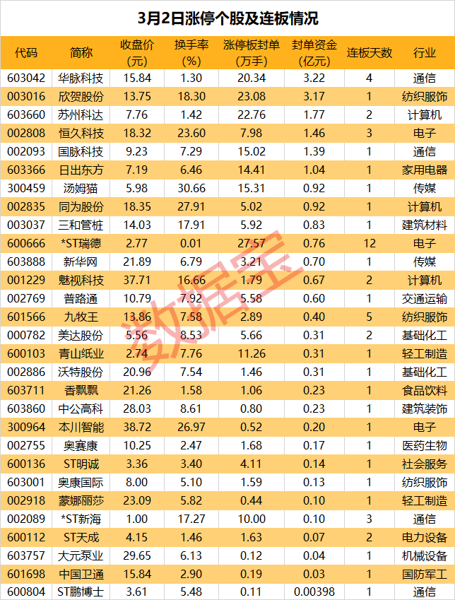 以封单金额计算,6股封单金额超亿元,华脉科技、欣贺股份、苏州科达涨停板封单资金居前,分别为3.22亿元、3.17亿元、1.77亿元。