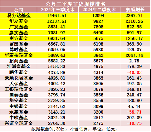 公募基金三季报出炉,易方达基金、华夏基金、华泰柏瑞基金的非货基金规模增长居前,其中,不少增量来源于宽基ETF的规模增长。