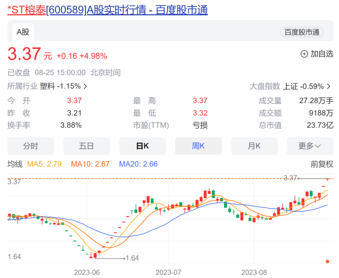 值得注意的是,8月24日、25日,*ST榕泰股价连续涨停,且近三个交易日累计涨幅超过12%。25日晚间,公司还披露了一份股票交易异常波动暨风险提示公告。公司称,目前经营情况正常,经营环境未发生重大变化。