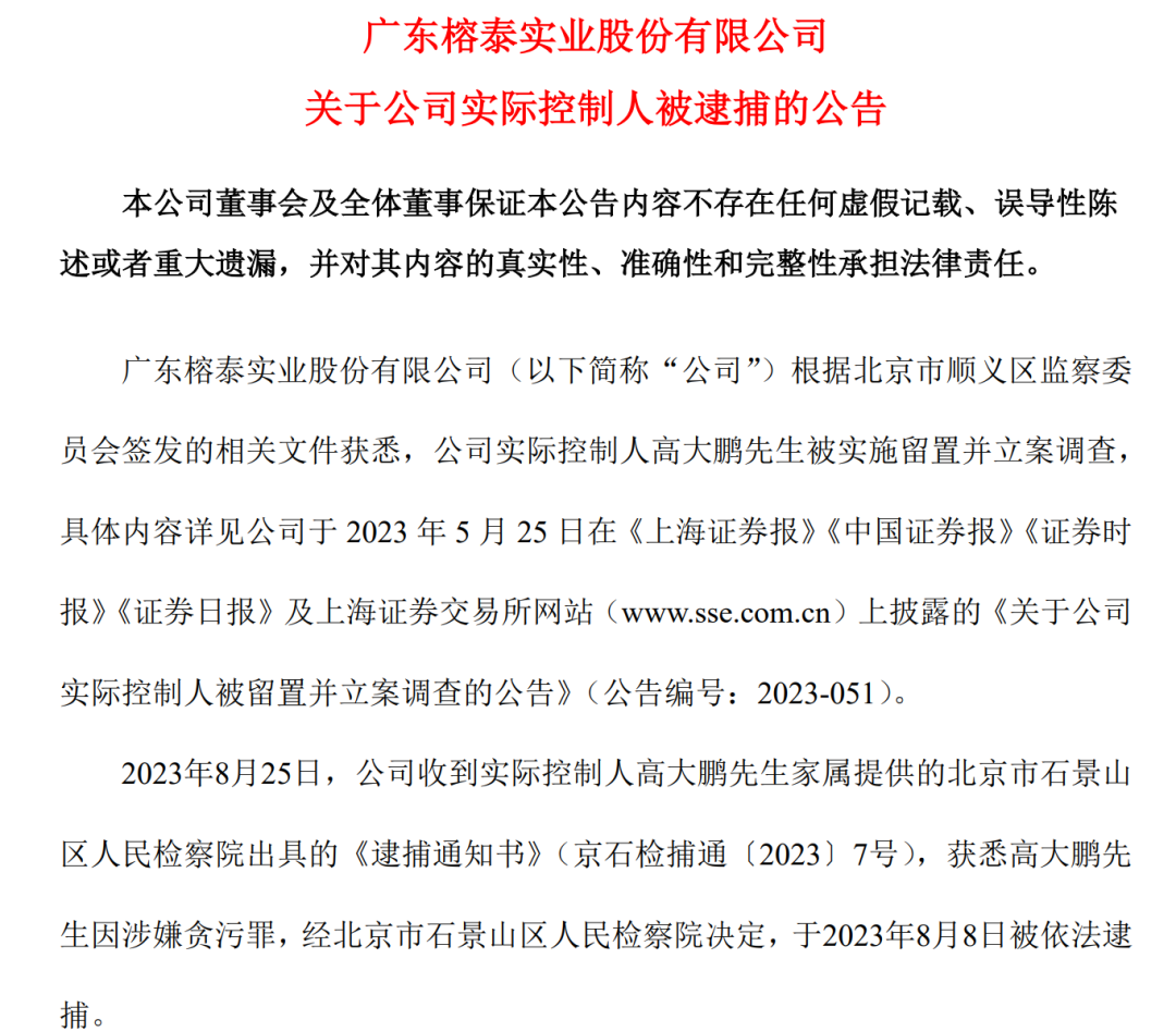 8月25日晚间,*ST榕泰公告称,当日,公司收到实控人高大鹏家属提供的北京市石景山区人民检察院出具的《逮捕通知书》(京石检捕通〔2023〕7号),获悉高大鹏因涉嫌贪污罪,经北京市石景山区人民检察院决定,于2023年8月8日被依法逮捕。
