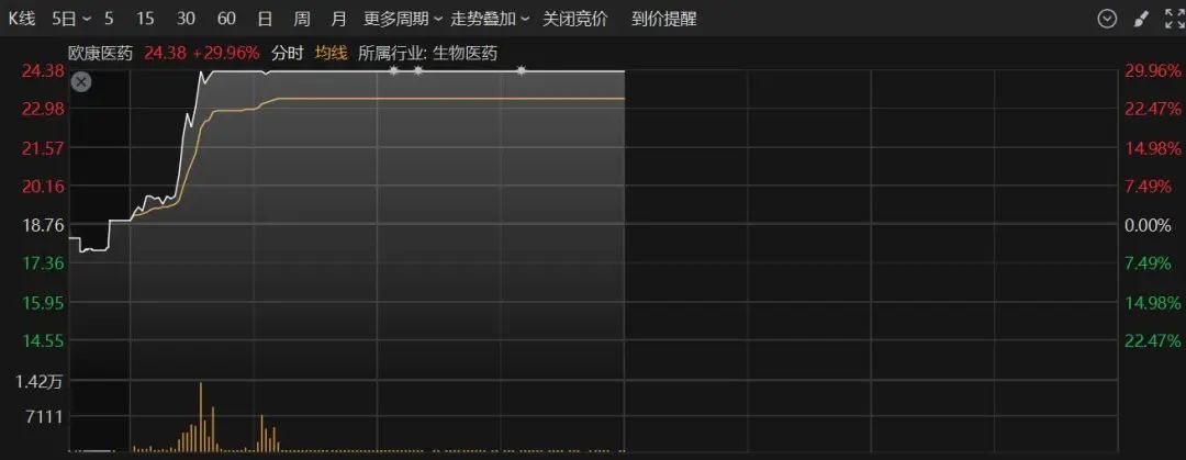 CXO概念、免疫治疗、化学制药、减肥药等板块也均放量大涨,均创去年10月8日以来最大涨幅。欧康医药30%涨停,多瑞医药连续第2日20%涨停,和元生物、蔚蓝生物、昭衍新药等亦批量涨停。