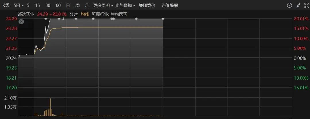 医药股集体大涨医药股早间集体上攻,创新药方向领涨,板块指数高开高走,盘中一度放量大涨近6%,创近半年来最大涨幅,并创年内新高,半日成交超昨日全天成交。诚达药业不到15分钟就直线20%涨停,热景生物、哈三联、罗欣药业等近20股也强势涨停或涨超10%。