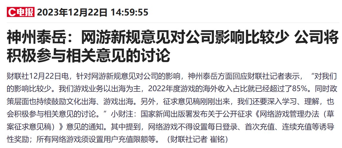 神州泰岳方面回应财联社记者表示,“对我们的影响比较少。我们游戏业务以出海为主,2022年度游戏的海外收入占比就已经超过了85%。同时政策层面也持续鼓励文化出海、游戏出海。另外,征求意见稿刚刚出来,我们还要深入学习、理解,也会积极参与相关意见的讨论。”