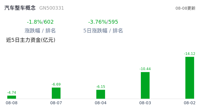 汽车整车概念板块在7月18日出现日线级别牛点。60分钟级别还处于熊点区间,指数还处于强势震荡区间。短期上方压力能否有效突破是关键。从板块走势与资金的配合程度看,汽车整车概念 5日累计涨幅-3.76%,排名概念第595名,97%个股下跌。5日和1日主力均流出,但已经能看到流出速度减慢。