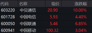 8月22日早盘,三大通信运营商震荡走强。截至发稿,中国联通涨超6%,中国电信涨超4%,中国移动涨超3%。