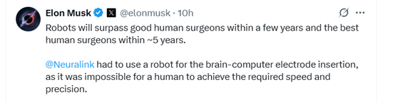 埃隆·马斯克最新发帖预测,机器人将在五年内超越人类最优秀的外科医生。